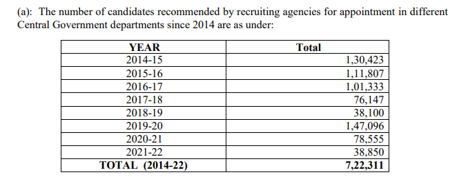 जवाब में कार्मिक, पेन्शन और लोक शिकायत राज्य मंत्री डॉ. जितेंद्र सिंह ने बताया कि 2014 से 2022 अब तक केंद्र सरकार ने 7 लाख 22 हजार 311 पदों पर भर्तियां की हैं. इसमें सबसे ज्यादा साल 2019-20 में 1,47,096 लोगों की भर्ती हुई थी. जबकि साल 2018-19 में सबसे कम 38,100 लोगों की भर्ती हुई थी.