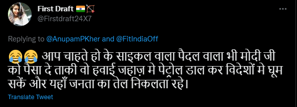 ”आप चाहते हो कि साइकिल वाला और पैदल वाला भी मोदी जी को पैसा दे, ताकि वो हवाई जहाज़ मे पेट्रोल डालकर विदेशों मे घूम सकें और यहां जनता का तेल निकलता रहे.”