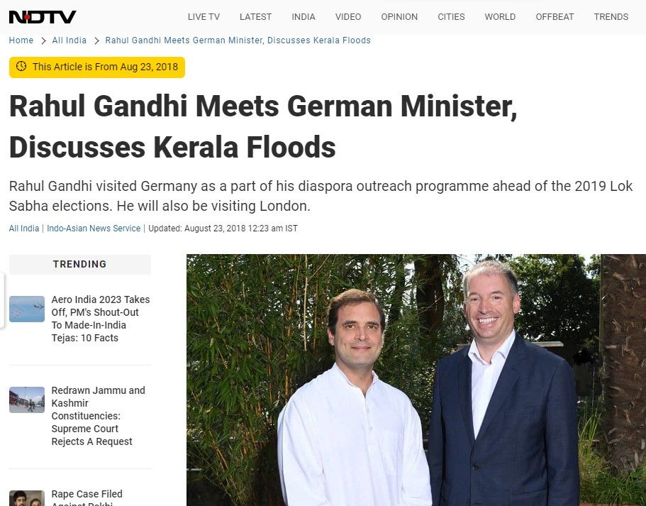 ‘टाइम्स ऑफ इंडिया’ में छपी रिपोर्ट के मुताबिक, राहुल गांधी साल 2018 के अगस्त महीने में ब्रिटेन और जर्मनी की यात्रा पर थे. राहुल की इस यात्रा का मकसद प्रवासी भारतीयों से संवाद स्थापित करना था. इस दौरान राहुल ने हैम्बर्ग और बर्लिन में जनसभाओं को संबोधित किया था.