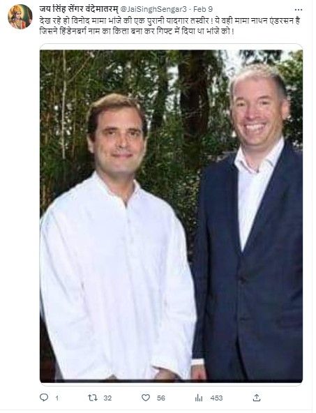 हिंडनबर्ग रिसर्च वाले नाथन एंडरसन के साथ दिखे राहुल गांधी. इस दावे के साथ सोशल मीडिया पर एक तस्वीर वायरल है. तस्वीर में राहुल गांधी के बगल में एक शख्स खड़ा है जिसे हिंडनबर्ग रिसर्च कंपनी का मालिक नाथन एंडरसन बताया जा रहा है.
