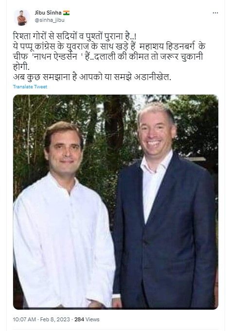 'रिश्ता गोरों से सदियों व पुश्तों पुराना है..! ये पप्पू कांग्रेस के युवराज के साथ खड़े हैं महाशय हिडनबर्ग के चीफ 'नाथन ऐन्डर्सन' हैं. दलाली की कीमत तो जरूर चुकानी होगी. अब कुछ समझाना है आपको या समझे अडानी खेल.'