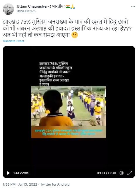 सोशल मीडिया पर झारखंड का बताकर एक वीडियो वायरल हो रहा है. वीडियो में कुछ बच्चे यूनिफॉर्म पहने हुए दिख रहे हैं, जो लाइनों में खड़े हैं. इन बच्चों में से एक बच्चा अज़ान दे रहा है. दावा है कि झारखंड के स्कूलों में अल्लाह की इबादत की जा रही है.