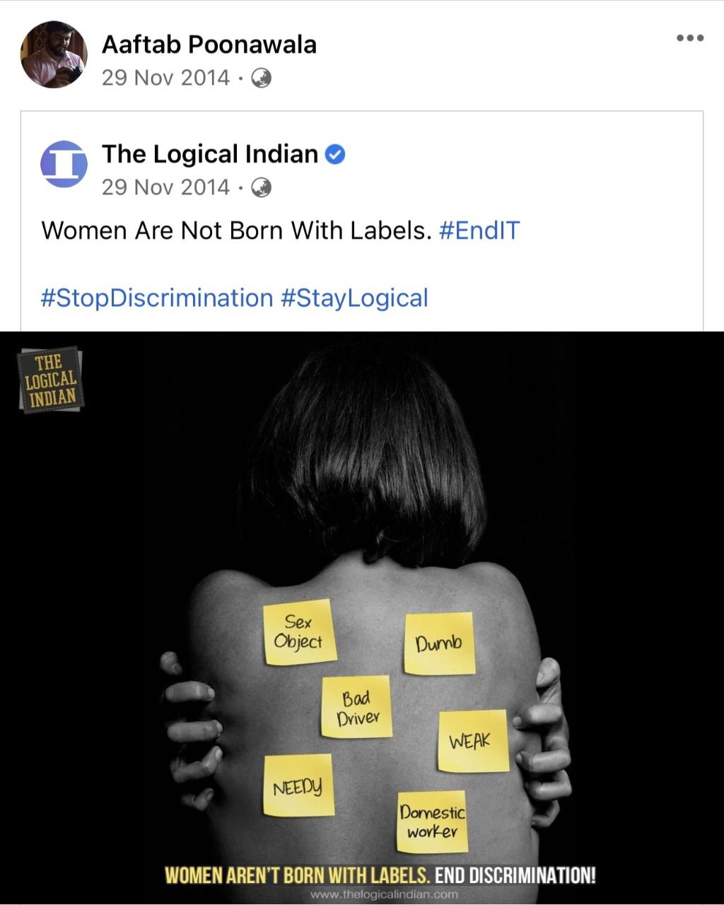 29 नवंबर 2014 को आफ़ताब ने लॉजिकल इंडियन वेबसाइट की एक पोस्ट शेयर की थी. तस्वीर में एक महिला की पीठ पर ढेर सारी चिप्पियां लगी हुई हैं और कैप्शन में लिखा है, "महिलाएं लेबल्स के साथ पैदा नहीं होतीं."