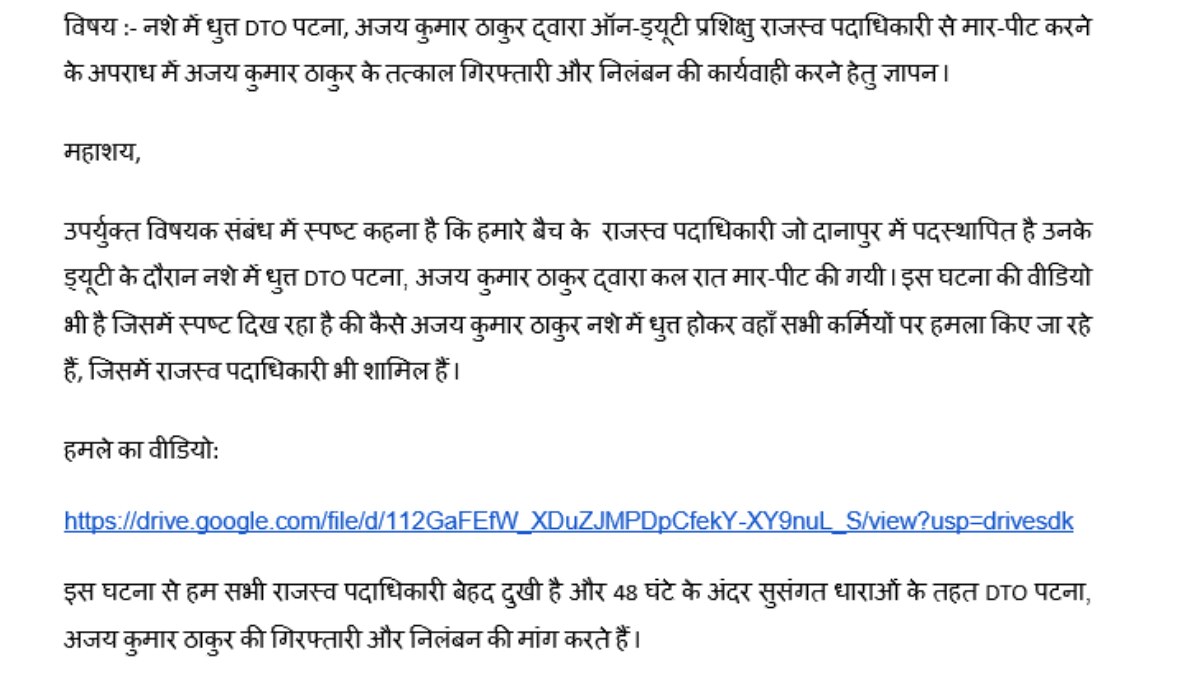 लेटर में कहा गया है कि अजय के खिलाफ 48 घंटे के अंदर कार्रवाई हो. अगर नहीं हुई, तो अधिकारी हड़ताल पर चले जाएंगे. ये लेटर बिहार के मुख्यमंत्री नीतीश कुमार समेत कई बड़े अधिकारियों को भेजा गया है.