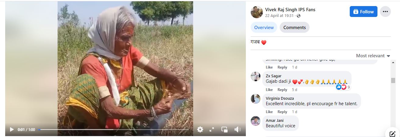 चिलचिलाती धूप में गाना गाती दादी का ये वीडियो 22 अप्रैल को शेयर किया गया. तब से अब तक इस वीडियो पर 35 लाख से ज्यादा व्यूज़ आ चुके हैं. एक लाख से ज्यादा लोग वीडियो को लाइक कर चुके हैं. ढेरों यूजर्स कॉमेंट कर अपने रिएक्शन भी दे रहे हैं. वीडियो देखकर लोग बुजुर्ग महिला के कॉन्फिडेंस और आवाज़ की तारीफ कर रहे हैं.
