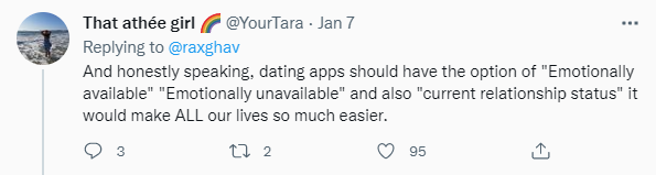 "ईमानदारी से कहूं तो डेटिंग ऐप्स में 'इमोशनली अवेलेबल', 'इमोशनली अनअवेलेबल' और 'करेंट रिलेशनशिप स्टेटस' का विकल्प होना चाहिए. यह हमारे सभी जीवन को इतना आसान बना देगा."