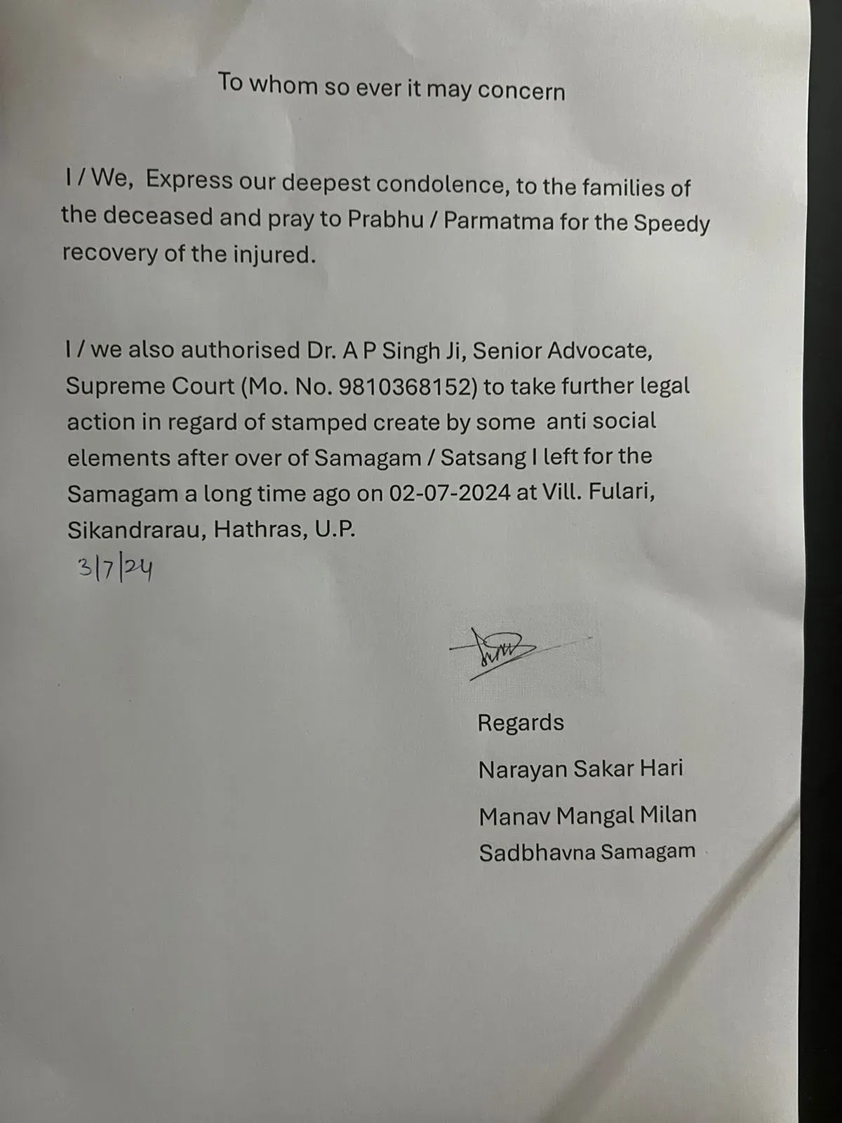 "मैं मृतकों के परिवारों के प्रति अपनी गहरी संवेदना व्यक्त करता हूं और घायलों के शीघ्र स्वस्थ होने के लिए प्रभु से प्रार्थना करता हूं. सुप्रीम कोर्ट के सीनियर वकील डॉ एपी सिंह को भगदड़ मचाने वाले असमाजिक तत्वों के खिलाफ कानूनी कार्रवाई के लिए अधिकृत किया गया है. मैं 2 जुलाई को ग्राम फुलरई, सिकंदरा राऊ, हाथरस में आयोजित सत्संग से काफी समय पहले ही निकल चुका था."