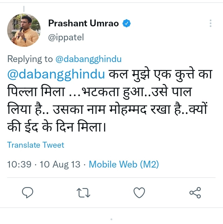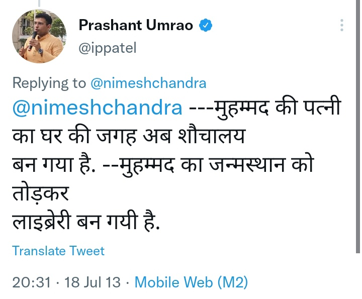 प्रशांत पटेल उमराव (Prashant Patel Umrao). उत्तर प्रदेश बीजेपी के मीडिया पैनलिस्ट और सुप्रीम कोर्ट के वकील हैं. सोशल मीडिया पर प्रशांत पटेल उमराव के कुछ पुराने विवादित ट्वीट वायरल हुए. इन विवादित ट्वीट्स के वायरल होने के बाद प्रशांत पटेल उमराव का ट्विटर अकाउंट डिएक्टिवेट दिखने लगा. विवादित ट्वीट्स कुछ इस तरह से हैं. मसलन, 10 अगस्त 2013 को किए गए एक ट्वीट में प्रशांत ने लिखा,