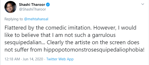 वीडियो में सलोनी गौर ने भारी-भारी अंग्रेज़ी के शब्द फेंके. शशि थरूर की एक्सेंट में. वो शब्द भी जो शशि थरूर ने एक 'जर्नलिस्ट' के लिए इस्तेमाल किए थे और ये वाकया बहुत फेमस हुआ था. सलोनी गौर के वीडियो को फिल्म डायरेक्टर हंसल मेहता ने रीट्वीट करते हुए शशि थरूर को टैग किया. उन्होंने लिखा- ये बहुत अच्छा है. शशि थरूर, आपने इसे देखा है?