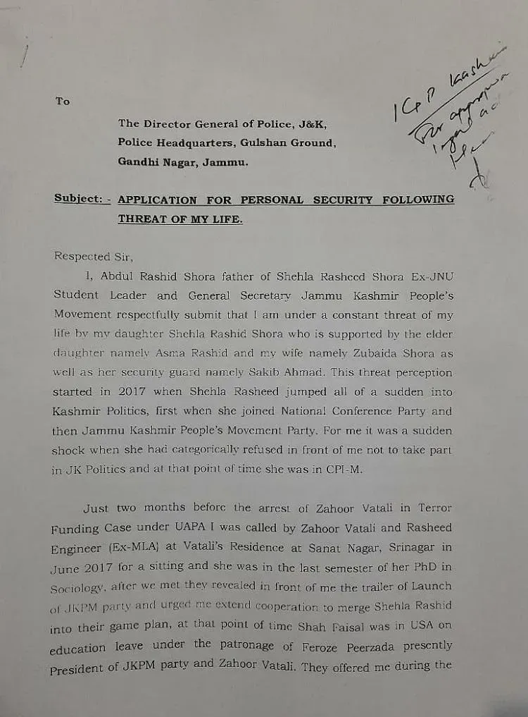 इस लेटर में अब्दुल राशिद शोरा ने लिखा कि ये 2017 में शुरू हुआ जब शेहला ने नेशनल कॉन्फ़्रेन्स और बाद में जम्मू-कश्मीर पीपल्स मूव्मेंट पार्टी की सदस्यता ली. अब्दुल ने कहा है कि ये उनके लिए झटके जैसा था, क्योंकि जब शेहला CPI-M की सदस्य थी तब जम्मू-कश्मीर की राजनीति में उतरने की उसकी कोई इच्छा नहीं थी.
