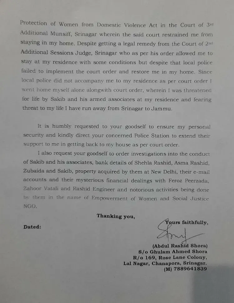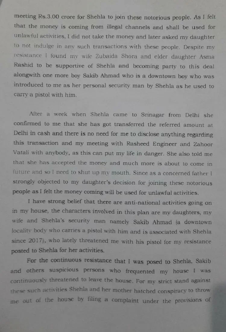 अब्दुल ने आरोप लगाए हैं कि शेहला ने चोरी छिपे जहूर और रशीद से पैसे ले लिए, और अब्दुल से कहा कि वो और किसी से इस बारे में न बताएं. अब्दुल ने लिखा है कि उन्हें पक्का यक़ीन है कि उनके घर में राष्ट्रविरोधी हरकतें हो रही हैं, जिसमें शेहला, उसकी बड़ी बहन और मां के साथ-साथ साकिब अहमद भी शामिल है.