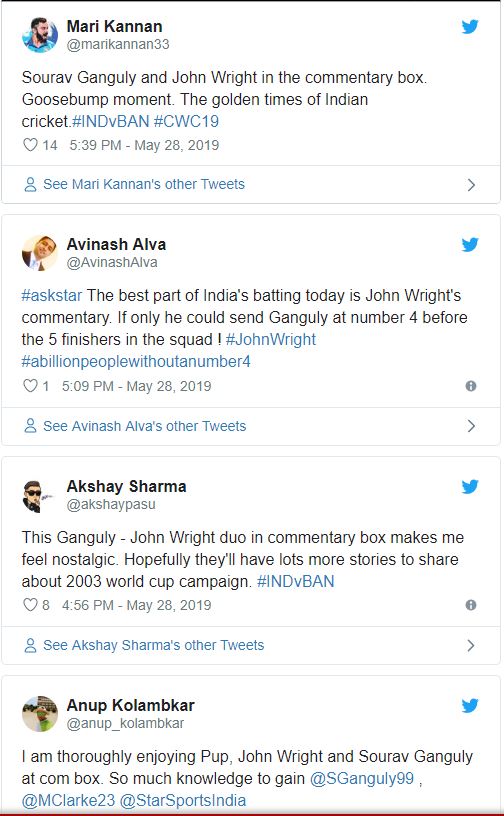 अब दोनों जब करीब एक दशक बाद कमेंट्री बॉक्स में साथ आए तो पुरानी यादों में खो गए. गांगुली कहने लगे, "जब मैं कप्तान था तो जॉन राइट सारे निर्णय लेते थे और मैं उनका पालन एक आज्ञाकारी शिष्य की तरह करता था." इसका राइट ने तुरंत जवाब दिया," इसका मतबल मेरी याददाश्त थोड़ी कमजोर हो गई है. क्योंकि मुझे तो याद है कि आप इंचार्ज थे औऱ मै तो बस पीछे ब्रैकग्राउंड में ही घूमता फिरता रहता था." गांगुली ने फिर जॉन राइट से पूछा कि क्या आपको 2003 वर्ल्ड कप के वॉर्म अप मैच का स्कोर याद है? साथ ही गांगुली ने ये भी कहा कि आप फ्लॉस डांस करके दिखाइए जैसा आप करते थे.