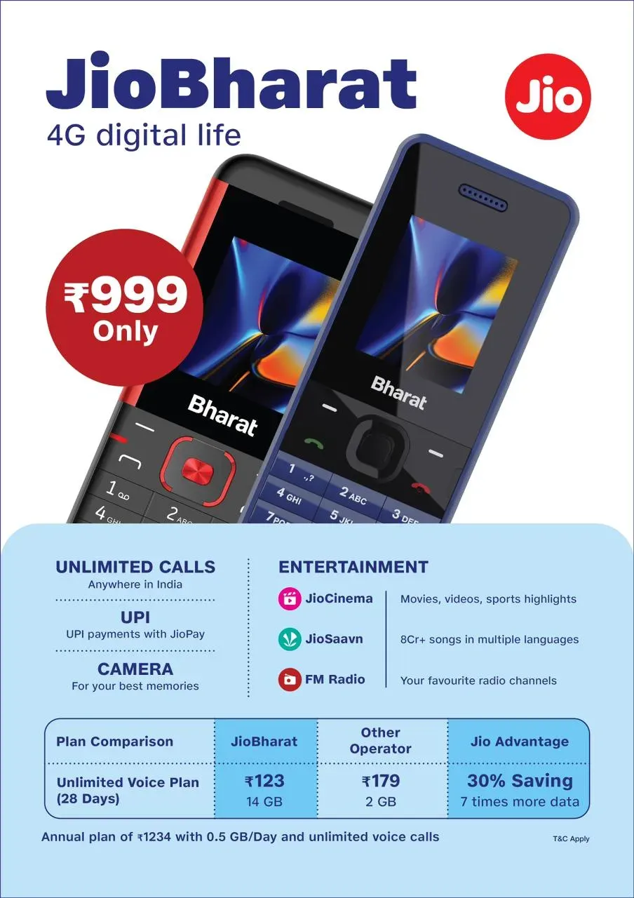 रिलायंस जियो ने नया 4G फोन ‘जियो भारत’ (Jio Bharat Phone) को लॉन्च कर दिया है. जियो ने Jio Bharat V2 को सिर्फ 999 रुपये में लॉन्च किया है. इस हैंडसेट के साथ दो नए प्लान्स भी लॉन्च किए गए हैं. जियो की तरफ से आने वाला यह फोन एक बेसिक फीचर फोन है. लेकिन हैंडसेट में इंटरनेट चलाने की सुविधा दी गई है. जियो ने भारतीय हैंडेसट मेकर कार्बन (Karbonn) के साथ पार्नटर्शिप की है. फोन के साथ जियो का प्लान लेना होगा जिसकी शुरुआती क़ीमत 123 रुपये महीना होगी. इसके साथ क्या और मिलेगा वो भी जान लेते हैं.