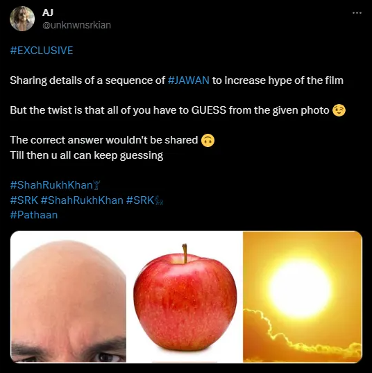 इसी में से एक अकाउंट ने ट्वीट किया, इसमें एक गंजा सिर नज़र आ रहा है. बीच में सेब है. और तीसरी सूरज की तस्वीर है. इसके आधार पर गेस किया जा रहा है कि कुछ समय पहले 'जवान' के लुक टेस्ट से शाहरुख की एक फोटो आई थी. इसमें वो गंजे नज़र आ रहे थे. फिर पता चला कि इस फिल्म में उनका डबल रोल होना है, बाप और बेटे का. खैर, असली मुद्दा ये है कि शाहरुख ने चेहरे पर पट्टी क्यों बांध रखी है? फैन्स के मुताबिक फिल्म के विलेन ने शाहरुख के पिता वाले किरदार को जला दिया है. जिसका वो बदला लेने जा रहा है. इसीलिए चेहरे पर पट्टी बंधी है. जलने की वजह से उसके सिर के बाल चले गए हैं. चेहरा भी झुलसा हुआ नज़र आता है. यहां फिट होता है, वो गंजे होने वाला लुक.