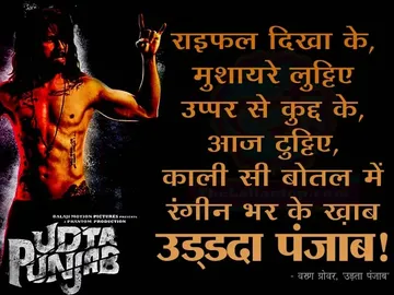 'उड़ता पंजाब'"राइफल दिखा के, मुशायरे लुट्टिएउप्पर से कुद्द के, आज टुट्टिए,काली सी बोतल में रंगीन भर के ख़ाबउड्ड-दा पंजाब!"