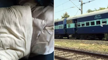 बाईं तरफ ट्रेन में मिलने वाले गंदे ओढ़ने-बिछौने- और तकिए, दाईं तरफ ट्रेन की सांकेतिक तस्वीर. (तस्वीर: ट्विटर)