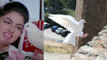 बाईं तरफ फिल्म 'मैंने प्यार किया' का एक सीन, जिसमें भाग्यश्री कबूतर के ज़रिये चिट्ठी भेज रही हैं. दाईं तरफ एक सफ़ेद कबूतर.