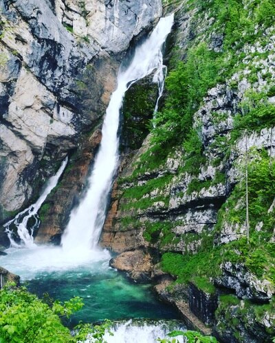 हमने बोहिंय झील पहुंच के गाड़ी पार्क की. एक घंटे पहाड़ पर हाइक कर बोहिंय नदी के उद्गम स्थल 'सवीस' झरने तक पहुंचे. स्लोवेनिया की सबसे ऊंची पहाड़ियों पर स्थित ट्रीग्लाव ग्लेशियर पिघलने पर बोहिंय नदी बनाता है. देख के अंदाज़ा नहीं लग रहा होगा पर असल में कुतुब मीनार जितनी ऊंचाई से गिरती है ये धाराएं.