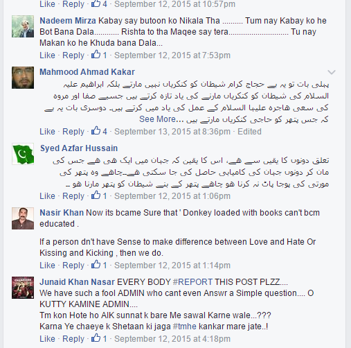 नय्यर ज़हीर ने लिखा इसी लिए तो मारते हैं, क्योंकि वो पत्थर का शैतान है. और दूसरी बात हम उस पत्थर की पूजा नहीं कर रहे, बल्कि ये पत्थर उस जगह पर रखे हैं जहां शैतान ने अल्लाह के पैगम्बर को बहकाया था. उसी जगह पर पत्थर मारे जाते हैं.