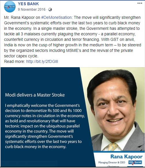 ''मैं इकॉनमी में मौजूद 500 और 1000 के नोट बंद करने के सरकार के फैसले का स्वागत करता हूं. ये एक साहसी और क्रांतिकारी कदम है. देश में चल रही पैरलल इकॉनमी पर ये करारा प्रहार होगा. इस कदम से पिछले दो साल से कालेधन पर लगाम लगाने के सरकार की तरफ से किए जा रहे प्रयास मजबूत होंगे. एक मास्टरस्ट्रोक में सरकार ने तीन बुराइयों को खत्म करने की कोशिश की है, जो देश को खाए जा रही हैं- एक पैरलल इकॉनमी, दूसरी नकली नोट और तीसरी टेरर फाइनेंसिंग.''ये शब्द हैं राणा कपूर के. यस बैंक के को-फाउंडर, पूर्व MD और CEO. नोटबंदी के अलावा जीएसटी की तारीफ करते हुए उन्होंने कहा था कि भारत अब ऊंची विकास दर की तरफ बढ़ रहा है. आज यस बैंक की हालत ख़राब है. यस बैंक के नॉन परफॉर्मेंस एसेट्स (NPA) बढ़े हुए हैं. बैंक के शेयर लगातार लुढ़कते जा रहे हैं. रिज़र्व बैंक (RBI) रेस्क्यू के लिए आगे आया है. स्टेट बैंक ऑफ इंडिया (SBI) को तैनात किया गया है कि बचाओ इसे. महीने में 50 हजार रुपए निकासी की सीमा तय की है. राणा कपूर ने मामले से 'उचित दूरी' बनाते हुए कहा,'मैं बैंक से पिछले 13 महीने से नहीं जुड़ा हूं. तो मुझे इसके बारे में कोई क्लू नहीं है.' भयंकर प्रॉफिट में चल रहा एक बैंक दलदल में कैसे फंस गया? इसके लिए बैंक के कर्ता-धर्ता राणा कपूर पर भी नज़र डालनी चाहिए.
