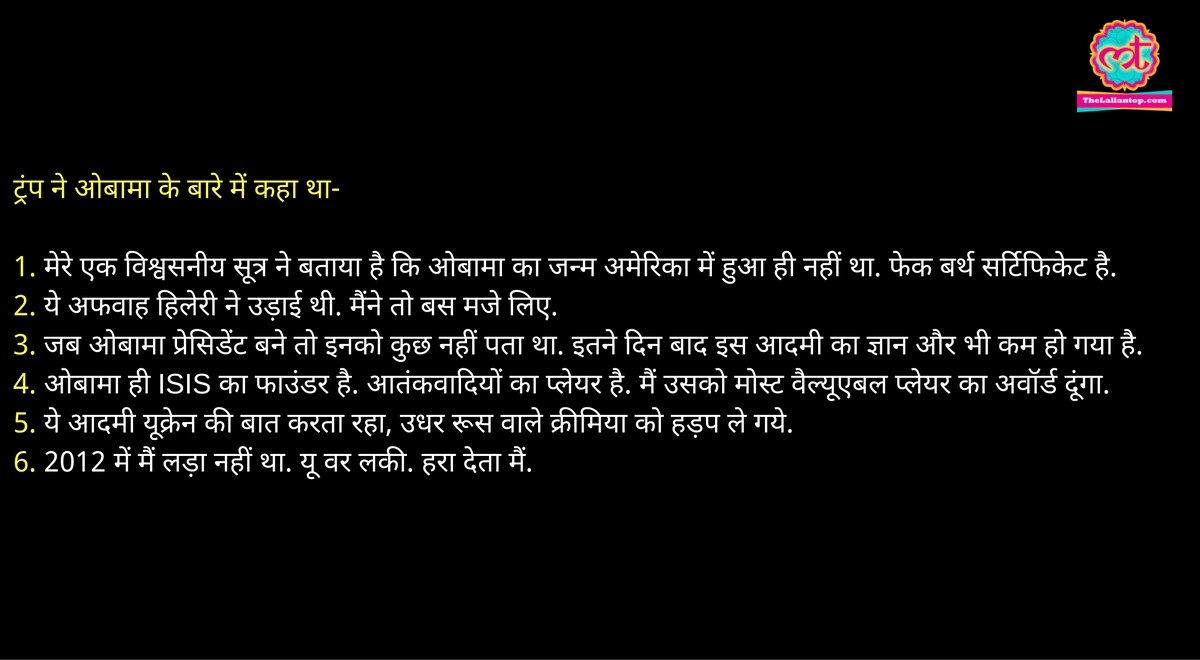 ट्रंप ने फिर ओबामा के बारे में कहा- ये आदमी अमेरिका के इतिहास का सबसे अज्ञानी आदमी है.ओबामा ने ट्रंप को सलाह दी- एक बढ़िया रूल है. जब लोग चिल्लाने लगें तो किसी भी सवाल का जवाब ना दो. चुप हो जाओ.