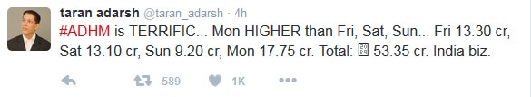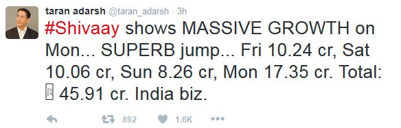 सोमवार को, हर रोज़ आगे रहने वाली ऐ दिल है मुश्किल, शिवाय के बराबर आ गयी. ये शिवाय के लिए बहुत बड़ा बूस्ट था. बहुत बहुत बड़ा. शिवाय की सबसे बड़ी कमाई वाला दिन था शुक्रवार. उस दिन 10.24 करोड़ मिले थे. सोमवार को 17.35 करोड़. ये डेढ़ गुने से भी अधिक था. वहीं ऐ दिल है मुश्किल अपने पेस से बढ़ रही है.
