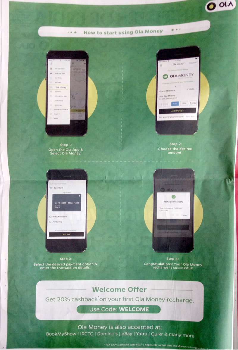 8. अब कैब कंपनियां डिस्काउंट दे रही हों, तो ओला कहां पीछे रहेगी. ओला का ऑफर है कि अगर आप पहला ओला मनी रीचार्ज करते हैं, तो आपको 20% कैशबैक मिलेगा. ओला मनी से आप कुछ और जगह भी पेमेंट कर सकते हैं.