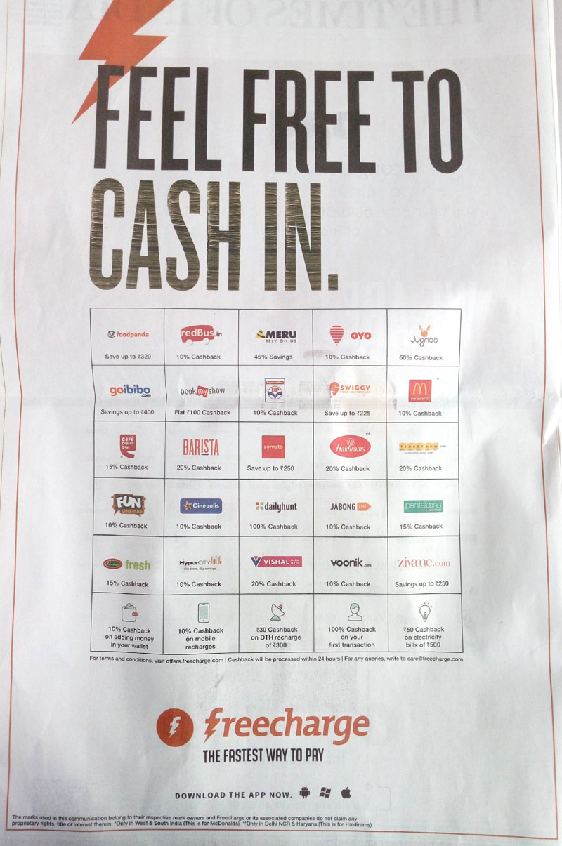 3. फ्रीचार्ज की तरफ से दो तरह के ऑफर आए हैं. एक तो इसने फ्रीचार्ज वॉलेट में रखी जा सकने वाली अमाउंट बढ़ाकर 10 हजार रुपए कर दी है. दूसरा, ये कई जगह पेमेंट करने पर 10 से 100% तक के कैशबैक का ऑफर दे रहा है.