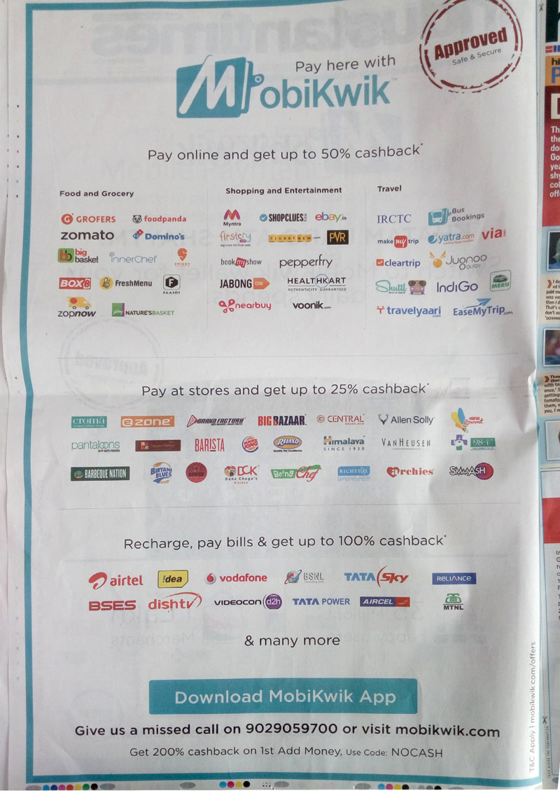 1. ऑनलाइन पेमेंट की सुविधा देने वाली ऐप्लिकेशन मोबीक्विक ऑनलाइन खरीदारी पर 50% तक के कैशबैक का ऑफर दे रही है. स्टोर्स पर इसके जरिए पेमेंट करने पर 25% कैशबैक का ऑफर है. इसके जरिए रीचार्ज और बिल पेमेंट करने पर 100% कैशबैक का ऑफर है.