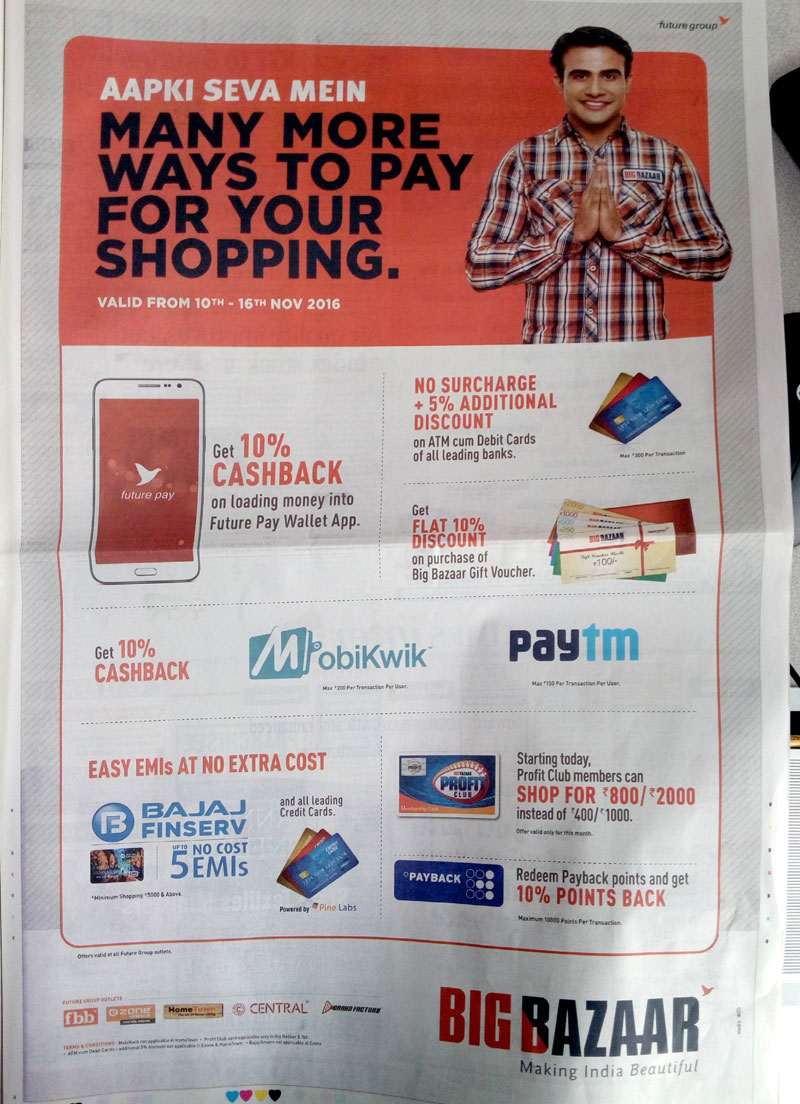 5. फ्यूचर ग्रुप के बिग बाजार में खरीदारी करने पर भी ऑफर्स हैं. अगर आप फ्यूचर पे ऐप की वॉलेट से पेमेंट करते हैं, तो 10% कैशबैक मिलेगा और कार्ड्स से पेमेंट करने पर 5 से 10% तक के ऑफर्स हैं. मोबीक्विक और पेटीएम से पेमेंट करने पर 10% कैशबैक है.