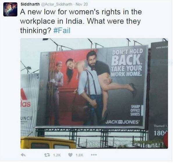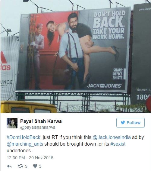 ऐसा ही एक सेक्सिस्ट ऐड 'जैक एंड जोंस' वालों ने बनाया है.ये कम्पनी कपड़े बनाती है. उसने देश भर में बारह ऐसी होर्डिंग लगा रखी थीं जिसमें एक जाना पहचाना आदमी एक लड़की को कंधे पर उठाए है. इस जाने पहचाने आदमी का नाम है रणवीर सिंह. तो इस ऐड में उन्होंने लड़की को कंधे पर उठा रखा है और बगल में हेडिंग लगी है. ''डोंट होल्ड बैक. टेक योर वर्क होम.'' यानी रुके मत रहो, अपना काम घर लेकर जाओ.