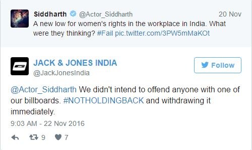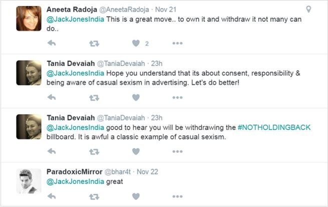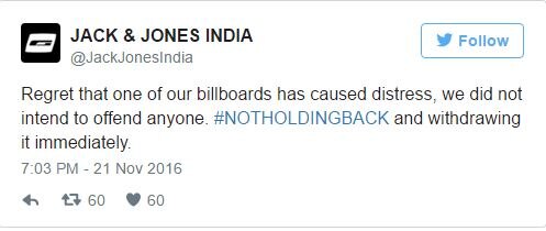 लाइव मिंट को भेजे एक ईमेल में जैक एंड जोंस के कंट्री हेड विनीत गौतम ने कहा ''हम एक प्रोग्रेस्सिव ब्रांड हैं. दुनिया भर के यूथ हमें पसंद करते हैं और हम अपनी जिम्मेदारी समझते हैं. हमें दुःख है कि हमारी होर्डिंग से लोगों को दिक्कत हुई. हमारा मकसद किसी को ऑफेंड करना नहीं था इसलिए हमने इन्हें हटवा लिया है.''
