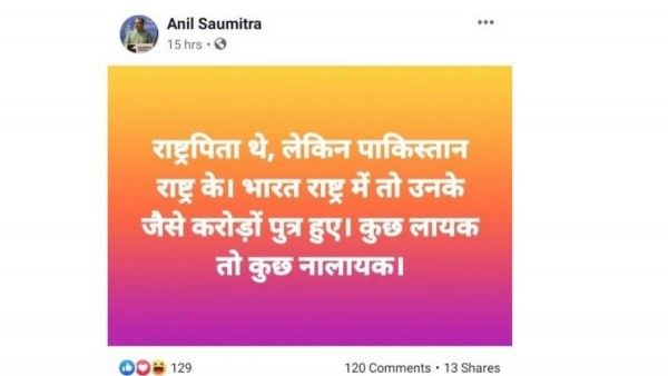 क्या था फेसबुक पोस्ट अनिल कुमार सौमित्र ने फेसबुक पोस्ट किया था. इस पोस्ट में लिखा था,राष्ट्रपिता थे, लेकिन पाकिस्तान राष्ट्र के. भारत राष्ट्र में तो उनके जैसे करोड़ों पुत्र हुए. कुछ लायक तो कुछ नालायक.ये पोस्ट देखिए: