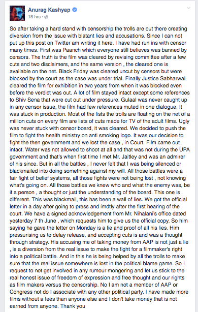"So after taking a hard stand with censorship the trolls are out there creating diversion from the issue with blatant lies and accusations. Since I can not put up this post on Twitter am writing it here. I have had run ins with censor many times. First was Paanch which everyone still believes was banned by censors. The truth is the film was cleared by revising committee after a few cuts and two disclaimers, and the same version , the cleared one is available on the net. Black Friday was cleared uncut by censors but were blocked by the court as the case was under trial. Finally Justice Sabharwal cleared the film for exhibition in two years from when it was blocked even before the verdict was out. A lot of film stayed intact except some references to Shiv Sena that were cut out under pressure. Gulaal was never caught up in any censor issue, the film had few references muted in one dialogue. It was stuck in production. Most of the lists the trolls are floating on the net of a million cuts on every film are lists of cuts made for TV of the adult films. Ugly was never stuck with censor board, it was cleared. We decided to push the film to fight the health ministry on anti smoking logo. It was our decision to fight the then government and we lost the case , in Court. Film came out intact. Water was not allowed to shoot at all and that was not during the UPA government and that's when first time I met Mr. Jaitley and was an admirer of his since. But in all the battles , I never felt that I was being silenced or blackmailed into doing something against my will. All those battles were a fair fight of belief systems, all those fights were not being lost , not knowing what's going on. All those battles we knew who and what the enemy was, be it a person , a thought or just the understanding of the board. This one is different. This was blackmail, this has been a wall of lies. We got the official letter in a day after going to press and imdtly after the first hearing of the court. We have a signed acknowledgement from Mr. Nihalani's office dated yesterday 7 th June , which requests him to give us the official copy. So him saying he gave the letter on Monday is a lie and proof of all his lies. Him pressurising us to delay release, and accepting cuts is and was a thought through strategy. His accusing me of taking money from AAP is not just a lie , is a diversion from the real issue to make the fight for a filmmaker's right into a political battle. And in this he is being helped by all the trolls to make sure that the real issue somewhere is lost in the political blame game. So I request to not get involved in any rumour mongering and let us stick to the real honest issue of freedom of expression and free thought and our rights as film makers versus the censorship. No I am not a member of AAP or Congress not do I associate with any other political party. I have made more films without a fees than anyone else and I don't take money that is not earned from anyone. Thank you"