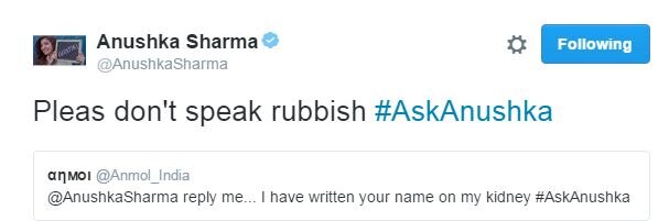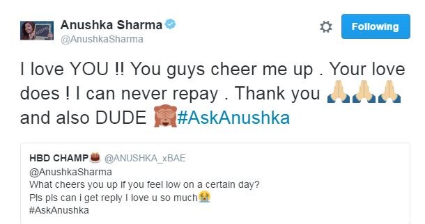 बीते गुरुवार अनुष्का शर्मा ने ट्विटर पर #AskAnushka पोस्ट किया. यानी अपने फैन्स से ट्विटर पर लाइव चैट की. फैन्स ने खूब सारे ट्वीट किए उनके नाम. और उन्होंने अपने फैन्स को जवाब दिए. लोगों ने अनुष्का की पर्सनल लाइफ से लेकर उनकी फिल्मों तक, हर तरह के सवाल पूछे. और अनुष्का ने बड़ी विनम्रता से उनका जवाब दिया.