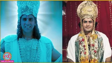 फिल्म 'ओह माय गॉड' के एक सीन में भगवान कृष्ण के अवतार में अक्षय कुमार. दूसरी तरफ 'रामायण' के एक सीन में भगवान राम के रोल में अरुण गोविल.