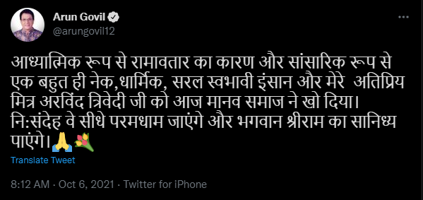 ''बहुत दुखद समाचार है कि हमारे सबके प्यारे अरविंद (रामायण के रावण) अब हमारे बीच नहीं रहे. भगवान उनकी आत्मा को शांति दे. इस दुख को बयान करने के लिए मेरे पास शब्द नहीं हैं. मैंने अपने गाइड, फादर फिगर और शुभचिंतक को खो दिया.''