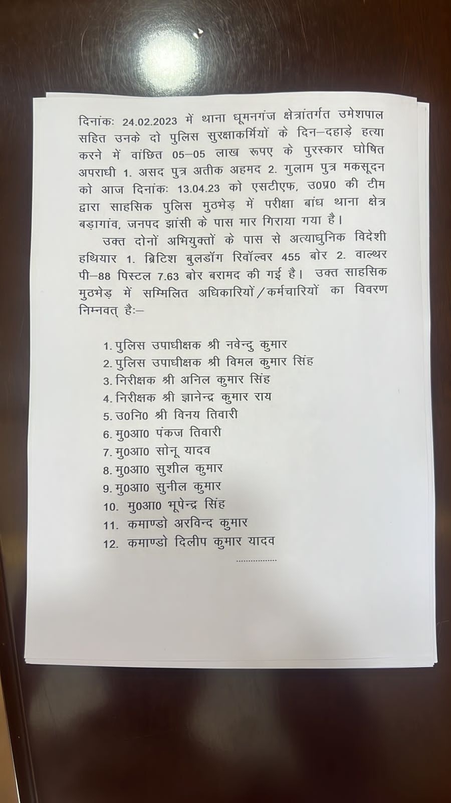 एनकाउंटर की जानकारी देते हुए पुलिस ने बताया कि पहले असद को जिंदा पकड़ने की कोशिश थी. खबर है कि उससे सरेंडर करने को भी कहा गया था. असद के एक साथी शूटर गुलाम का भी एनकाउंटर में मारा गया. STF के ADG अमिताभ यश ने बताया कि दोनों के पास से विदेशी हथियार भी बरामद हुए हैं. उनके पास ब्रिटिश बुलडॉग रिवॉल्वर 455 बोर और वाल्थर पी-88 पिस्टल 7.63 बोर थी.