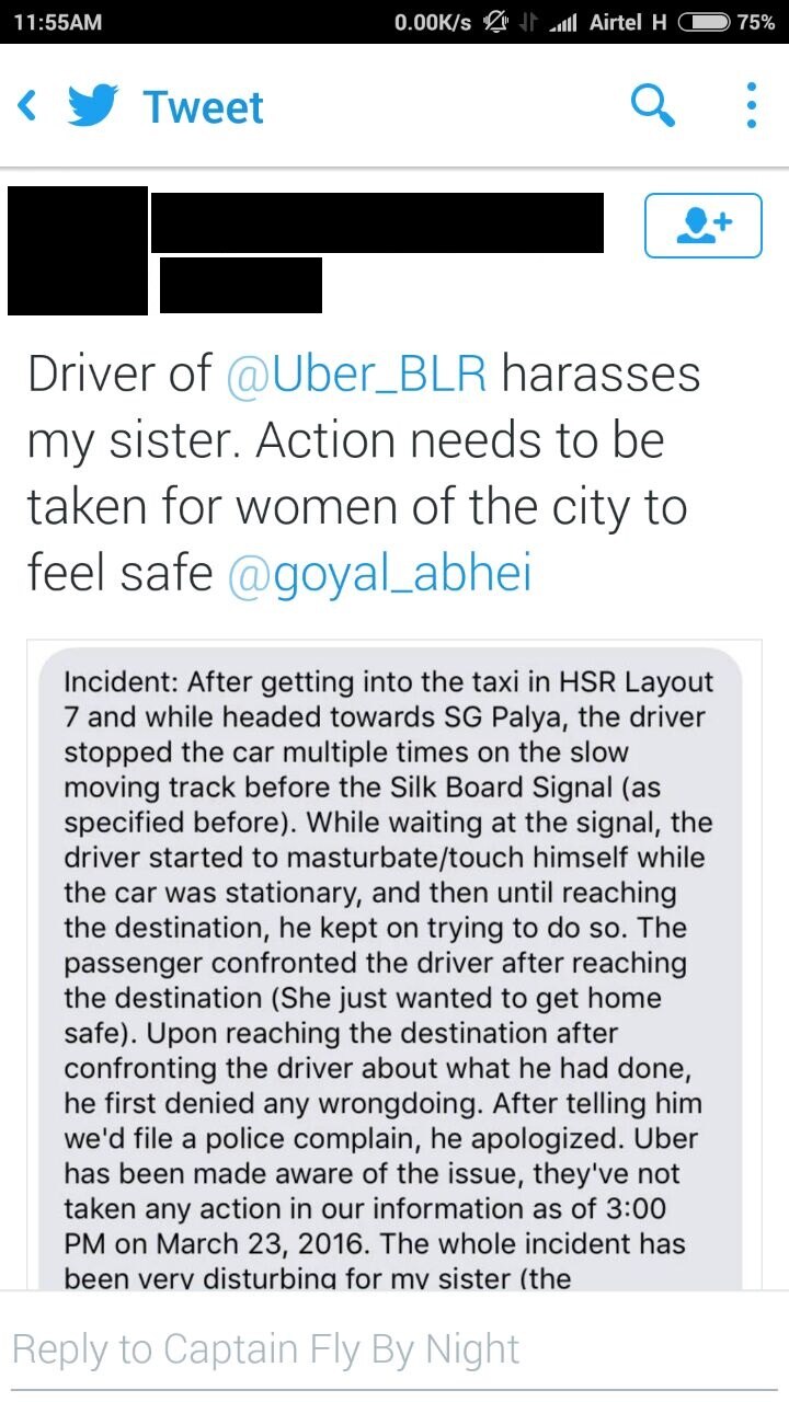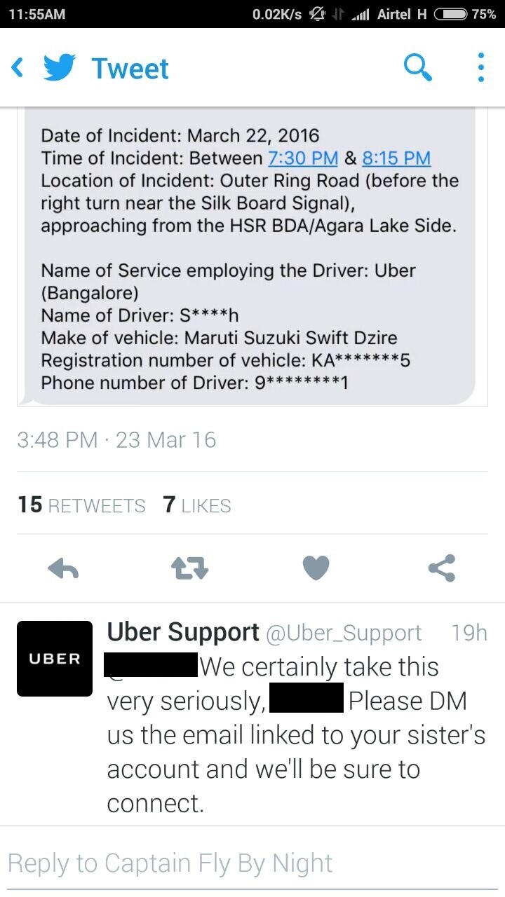 बैंगलुरू में रहने वाली इस लड़की का कहना है कि घटना की अगली सुबह ही उसने उबर कैब मैं शिकायत दर्ज करा दी थी. पर जब उबर ने कोई कदम नहीं उठाया तो लड़की के भाई के उबर कंपनी को टैग करते हुए ट्विटर पर इसकी शिकायत की. तब जा कर उबर से जवाब आया.