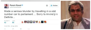ODD वाले दिन EVEN नंबर की गाड़ी से पार्लियामेंट पहुंचे सांसद. परेश रावल ने ट्वीट कर मांगी माफी, मगर..