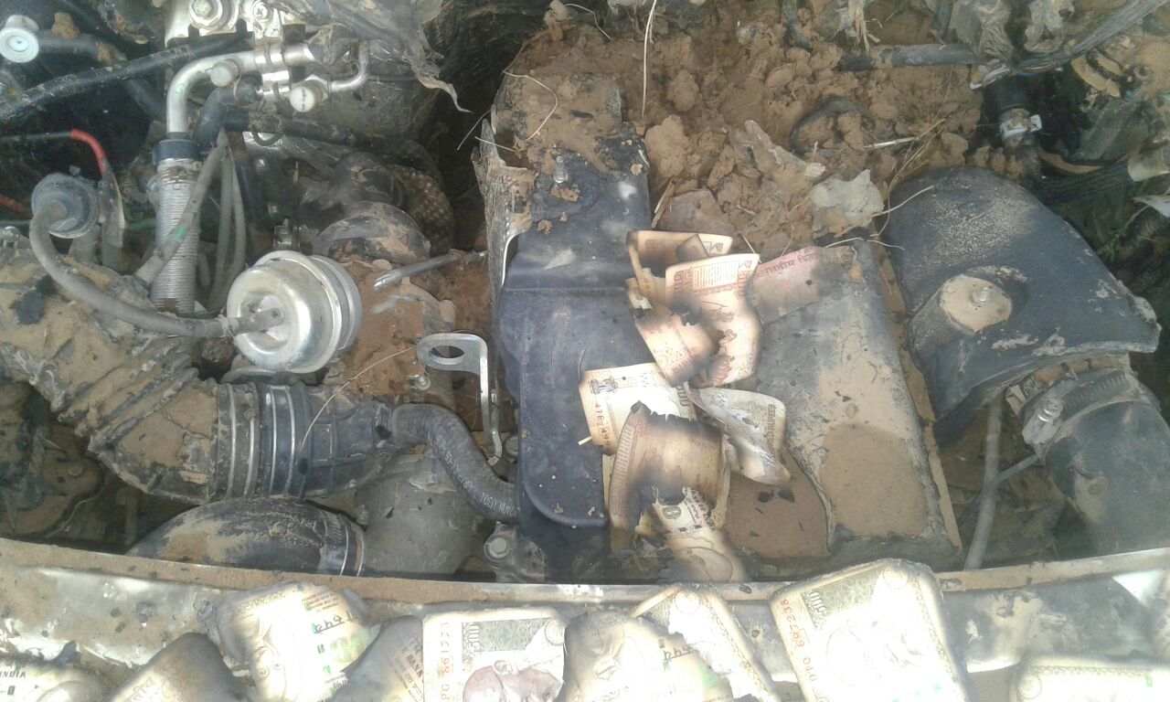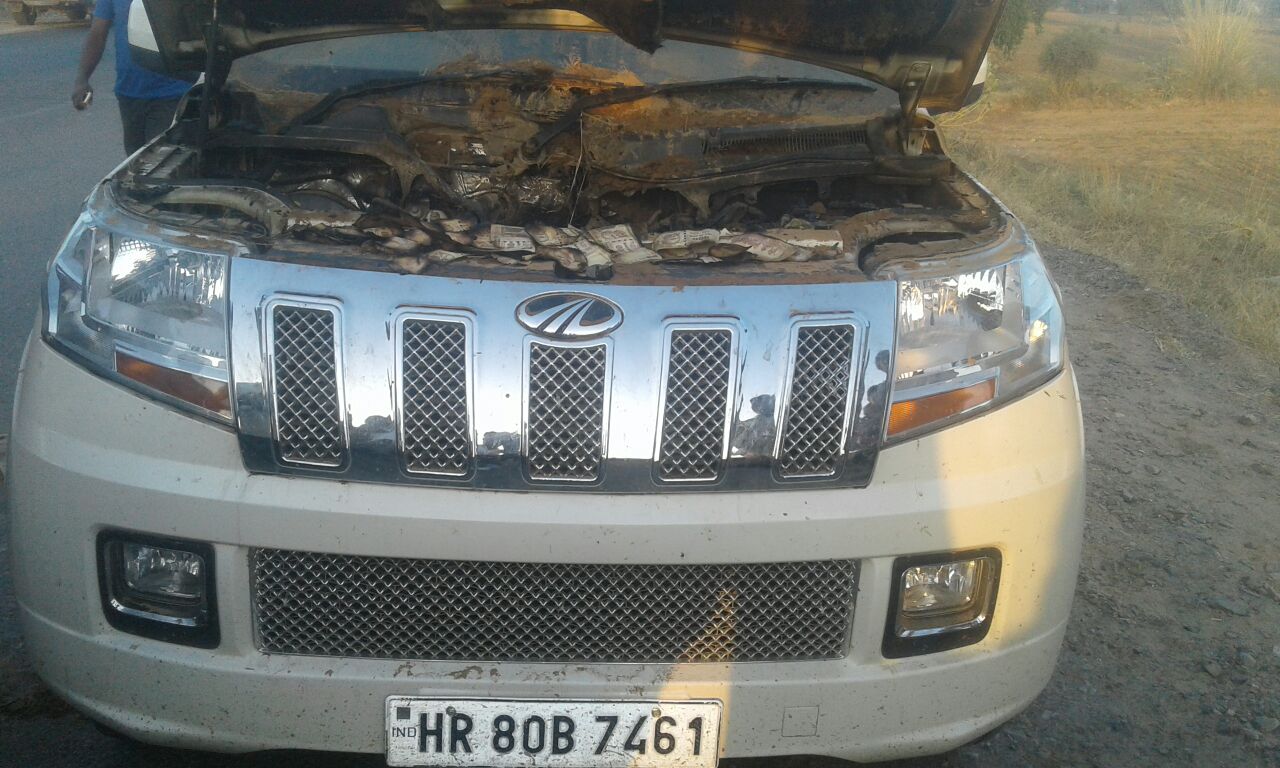 डोकवा रतनपुरा के बीच नेशनल हाईवे 65 से थानेदार अनिल बिश्नोई के पास फोन आया. कि साब यहां एक गाड़ी, महिंद्रा TUV300, नंबर HR B 7461 में आग लग गई है. उसके बोनट में जले हुए नोट हैं. थानेदार वहां पहुंचे तो अपनी आंखिन देखा. कि हजार और पनसउवा नोटों की गड्डियां जली पड़ी हैं. और नोट हवा में उड़ रहे हैं.