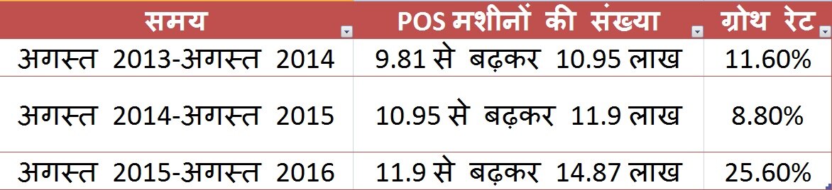 सितंबर 2012 में भारत में 7.41 लाख POS मशीनें थीं. जबकि सितंबर 2016 तक इनकी संख्या 14.96 लाख हो गई थी. बैंक वालों का कहना है कि इन मशीनों की संख्या अब महानगरों के अलावा, दूसरी श्रेणी के शहरों में भी तेजी से बढ़ रही है.