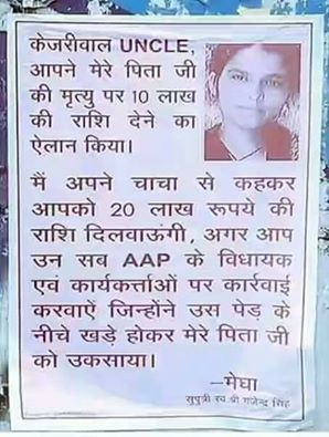 हिंदी पढ़ने वालों को टेक्स्ट तो दिख ही रहा होगा. लिखा है कि केजरीवाल अंकल हमें 10 लाख न दो. मैं आपको अपने चाचा से 20 लाख रुपए दिलाऊंगी. अगर आप उन AAP विधायकों पर कार्रवाई कराएं जिन्होंने पेड़ के नीचे खड़े होकर मेरे पिता जी को उकसाया.