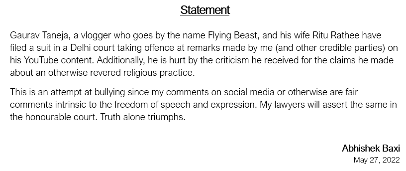 अपने खिलाफ केस दर्ज होने पर अभिषेक बख्शी ने बताया कि, गौरव तनेजा ने उनके और कुछ और लोगों पर दिल्ली की अदालत में केस दर्ज किया है. ये केस उनकी तरफ से तनेजा के यूट्यूब चैनल पर किए गए कमेंट को लेकर किया गया है.