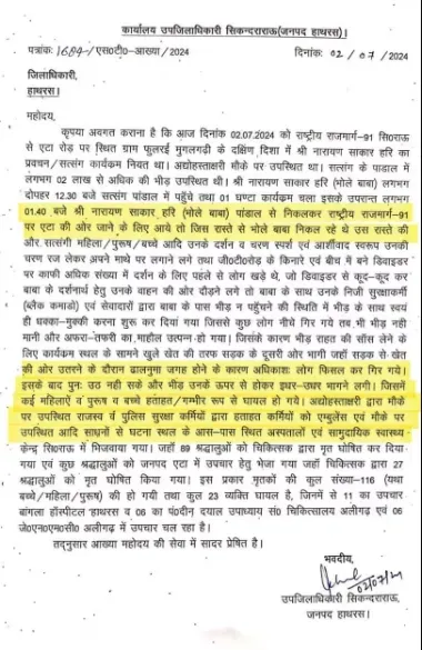 इंडियन एक्सप्रेस की रिपोर्ट के मुताबिक, सिकंदराराऊ के उपजिलाधिकारी (SDM) रविंद्र कुमार, जो कि खुद सत्संग के दौरान मौके पर मौजूद थे, उन्होंने यह रिपोर्ट हाथरस के जिलाधिकारी को सौंपी और जिलाधिकारी ने इस रिपोर्ट को मुख्यमंत्री को सौंपा. मुख्यमंत्री ने हादसे की जांच के लिए ADG आगरा और कमिश्नर अलीगढ़ की अध्यक्षता में कमेटी का गठन कर 24 घंटे के अंदर रिपोर्ट तलब के आदेश दिए थे.