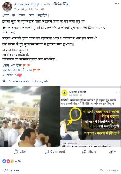 हां तो इस पोस्ट का मजमून ये है कि "गर्व से लिखें जय महादेव. इरानी मूल का युवक हज यात्रा के दौरन काबा के फेरे लगा रहा था. अचानाक काबा के पास पहुंचते ही उसने बोतल मे रखी दुध काबा की दिवार पर चढ़ा दिया. फिर पारसी भाषा में दावा किया की दिवार के अंदर शिवलिंग है और हम हिन्दू थे. इस घटना से पुरे मुस्लिम जगत मे हडकंप मचा हुआ है. लाहौल बिला कुव्वत. मक्केश्वर महादेव के शिवलिंग पर मोमीन द्वारा जल अभिषेक."