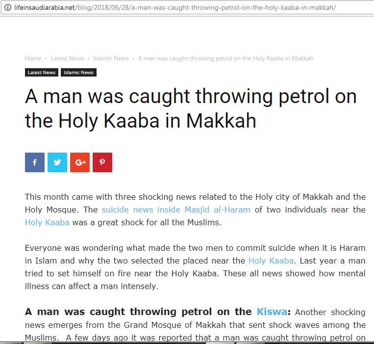 हमने गूगल पर सिंपल वाली इंगलिश में लिखकर सर्च किया man thrown petrol on kaaba. तमाम सारे लिंक निकलकर सामने आ गए. 28 जून को लाइफ इन सऊदी अरेबिया नाम की वेबसाइट ने इस पर खबर लगाई है. जिसमें साफ साफ लिखा है कि पवित्र काबा पर पेट्रोल फेंकते आदमी पकड़ा गया. कुछ बोल भी रहा था अनजान भाषा में, लेकिन कोई समझा नहीं. उसे अरेस्ट कर लिया गया है. ब्लास्फेमी(ईशनिंदा) वाली इस हरकत को मुस्लिम समाज टोलरेट नहीं करेगा.