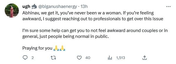 “हम समझ सकते हैं अभिनव, मेरा सुझाव है कि आपको मदद लेनी चाहिए. मुझे यकीन है कि थोड़ी सी मदद से आप कपल्स या आम लोगों के बीच जो ऑकवर्ड फील करते हैं, उससे राहत मिलेगी. मैं आपके लिए दुआ करूंगी.”