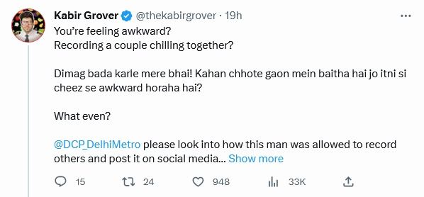 "आप ऑकवर्ड फील कर रहे हैं? इस कपल का वीडियो बनाते हुए? दिमाग बड़ा कर ले मेरे भाई. दिल्ली मेट्रो के डीसीपी, आपको देखना चाहिए कैसे इस आदमी ने दूसरों का वीडियो बनाकर सोशल मीडिया पर पोस्ट किया है."