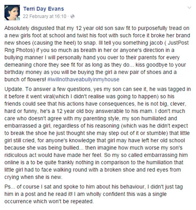 इवांस ने अपने बेटे को सबक सिखाने के लिए हैशटैग #Iwillnothaveabullyinmyhouse के साथ फेसबुक पर एक पोस्ट लिखा. उन्होंने लिखा कि जेकब अब वह अपनी बर्थडे मनी से उस लड़की के लिए नए जूते और फूल खरीदेगा और उसे देकर सॉरी बोलेगा. जेकब की ये हरकत बहुत शर्मनाक और घिनौनी है.